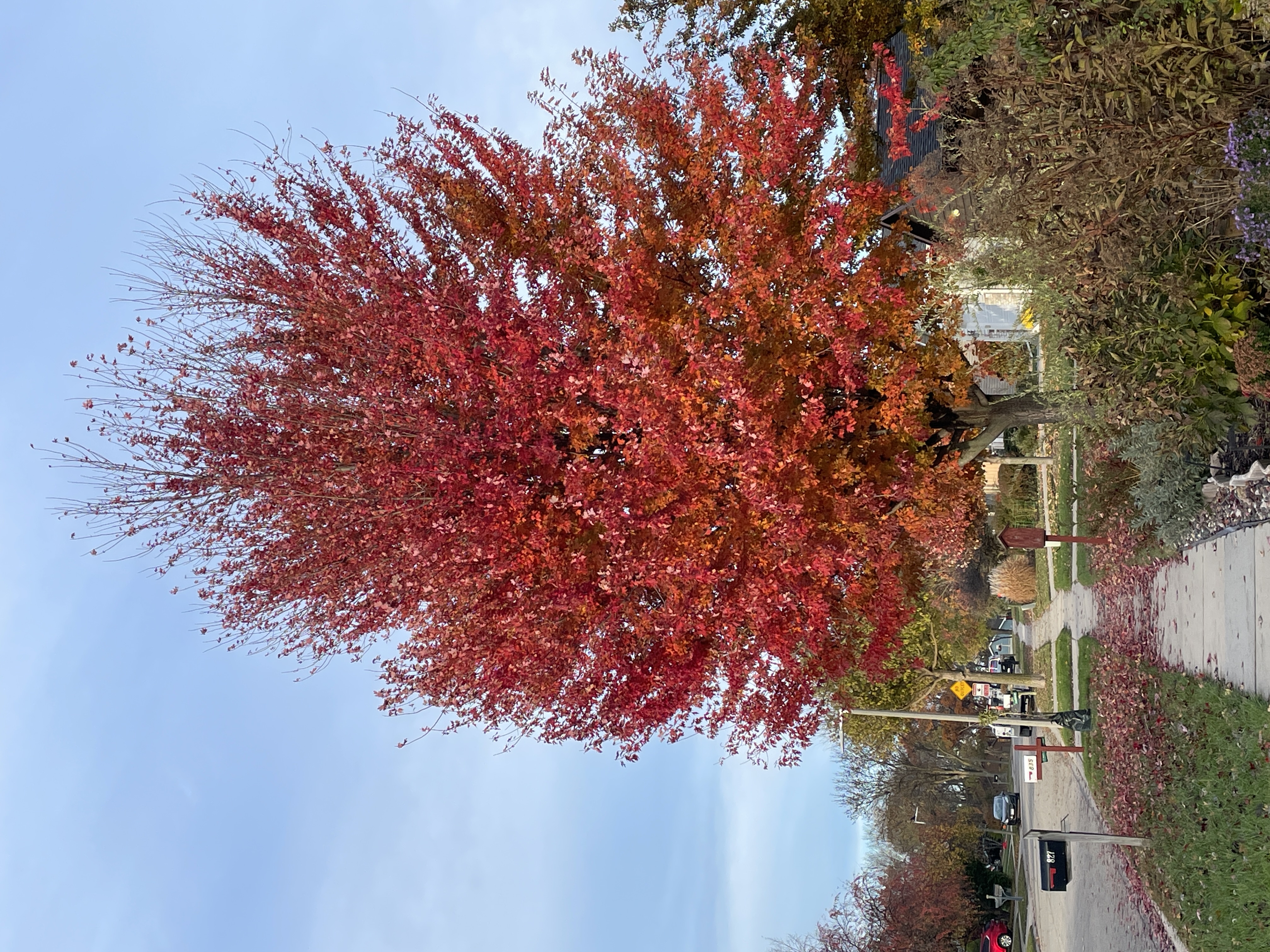 This tree is a mature example a Freeman maple, a cross between a red maple and a silver maple. It was planted on 8/25/2006, and is about 20 years old as pictured. This tree is one of the most popular patented cultivars of the Freeman maple: Autumn Blaze®.